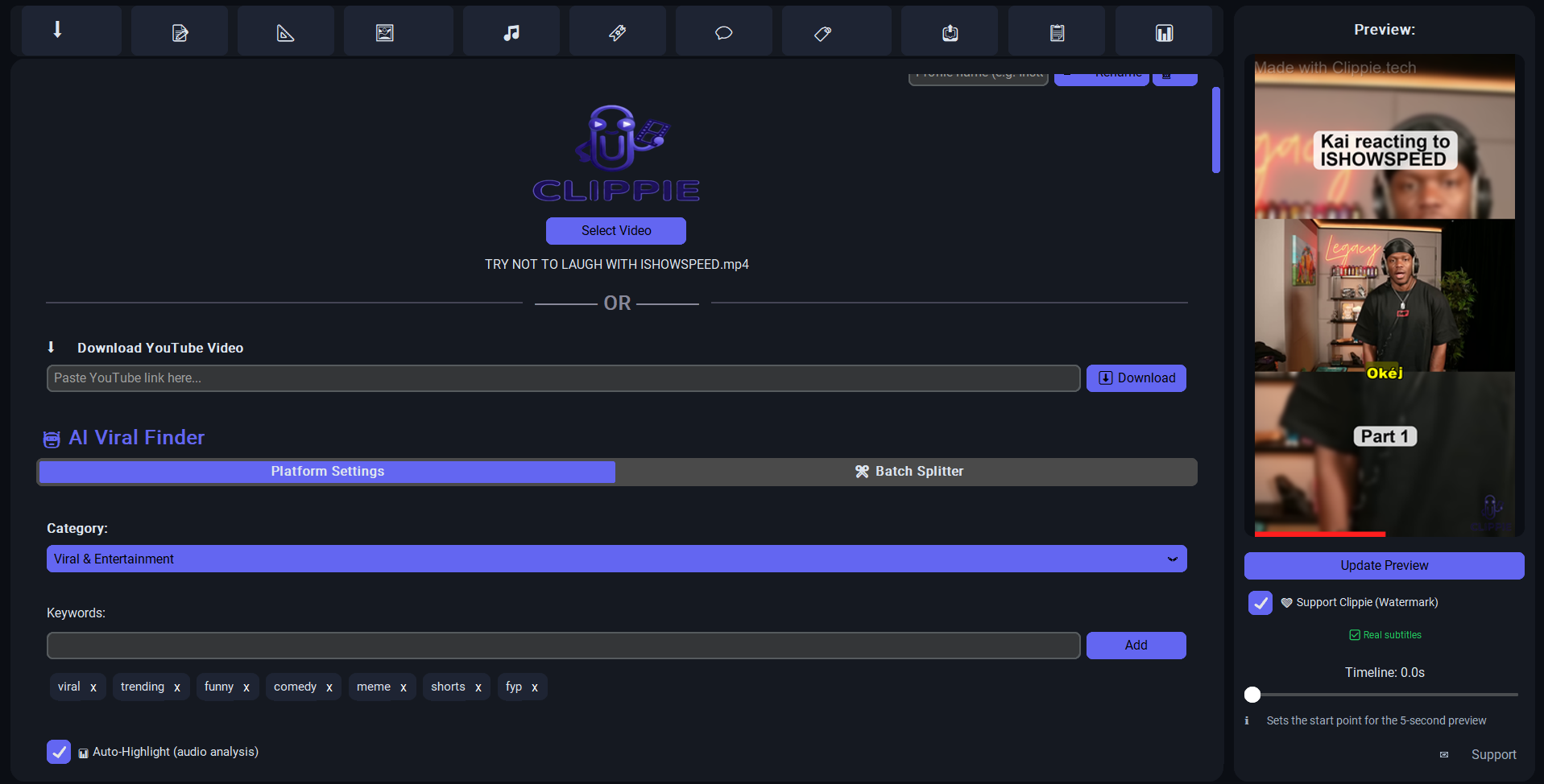 Whisper AI transcribes your video, detects viral moments, removes silence, and generates captions — all on your own CPU or GPU. No data leaves your PC. No API calls. No cloud.